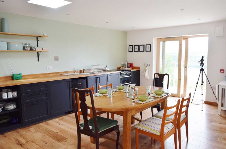 When our spacious function room is not being used for courses or events it has been designed to convert to a large 9m x 6m open plan suite for self-catering. It has its own entrance, kitchen and bathroom and a large terrace overlooking the estuary. A lockable door connects it to the rest of the building. Additional guests can book the room(s) next door if necessary. It has a comfortable kingsize bed with reading lights, a sofa and two comfortable armchairs. We have recently added a woodburner for the colder months (all wood is supplied from our own trees). Bed linen is organic, fair trade, with blankets by Weaver Green, made from recycled bottles. The tap water is very nice to drink, and there is plenty of crockery in the kitchen. The large bathroom / wet room has a storage cupboard, walk in shower, bamboo & cotton towels, handmade shampoo and soap bars by the Clovelly Handmade Soap Company. We also leave a travel tin so that you can take your soaps home with you. The kitchen area has a large oak table and chairs, with microwave, toaster, sink, gas cooker and small fridge. During the winter months, we may ask you to use the gas cooker to heat water and to make toast! There is a USB charging point for mobiles etc, and lots of books, games and jigsaws – just in case….